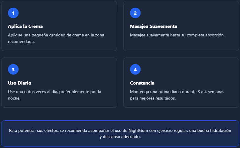 Esta crema mejora el flujo sanguíneo, refuerza los tejidos musculares y estimula la respuesta sexual sin causar efectos secundarios. Además, combate la fatiga y el estrés, aportando una sensación de energía constante. Con el uso diario, NightGum ayuda a equilibrar las hormonas, restaurar la vitalidad y devolver la confianza en tu rendimiento físico y sexual.